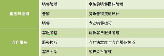 公司各個(gè)組織單元下的職能可以進(jìn)行進(jìn)一步的細(xì)分,根據(jù)細(xì)分的職能就可以確定專業(yè)方向上的培訓(xùn)課程體系。人力資源單元可以分為人力資源管理、招聘、員工發(fā)展、績效、薪酬、員工關(guān)系;行政單元可以分為行政管理、秘書;財(cái)務(wù)單元可以分為財(cái)務(wù)管理、會計(jì)、審計(jì);物流與供應(yīng)單元可以分為采購、物流、倉儲;生產(chǎn)與質(zhì)量管理單元可以分為生產(chǎn)管理、現(xiàn)場管理、流程管理、質(zhì)量管理、過程管理;銷售與營銷單元可以分為銷售團(tuán)隊(duì)管理、營銷、銷售、市場;客戶服務(wù)單元可以分為客服管理系統(tǒng)、客戶服務(wù)、客戶關(guān)系。以下為專業(yè)類課程體系部分部分內(nèi)容: